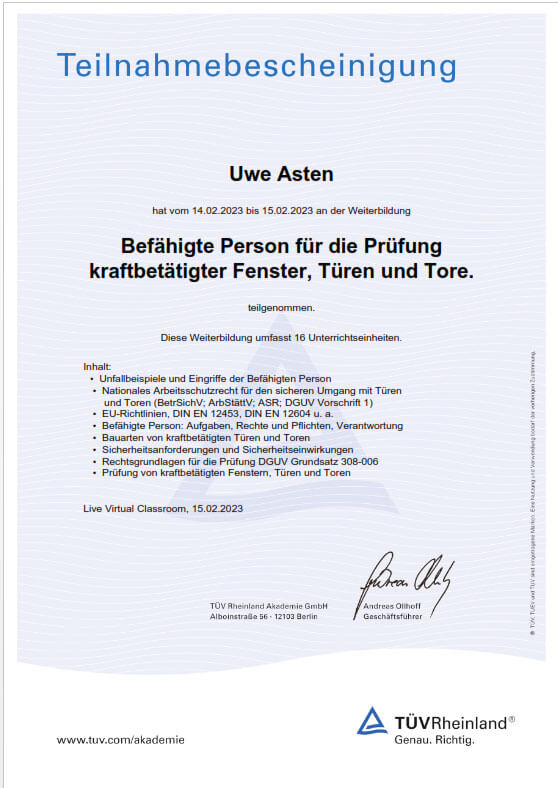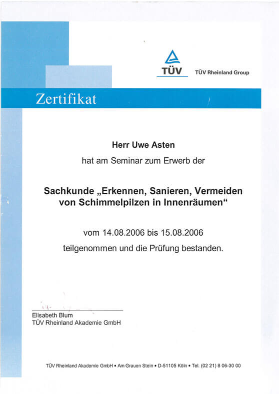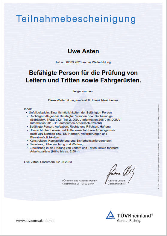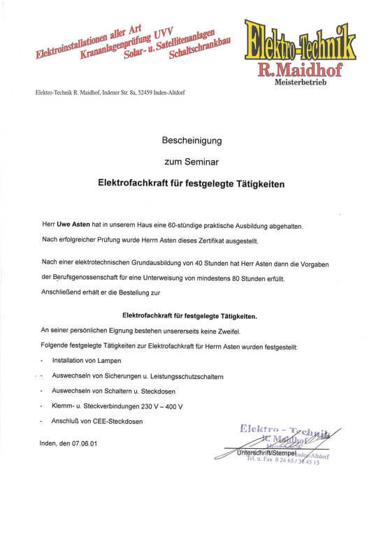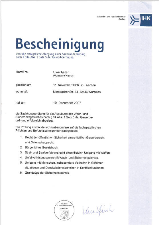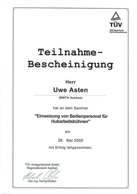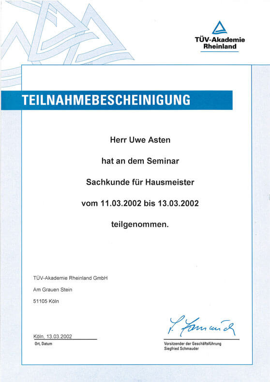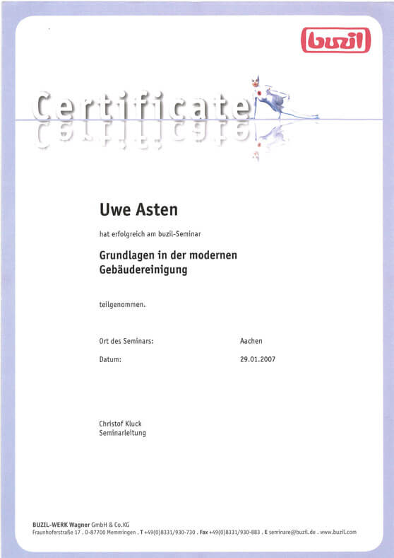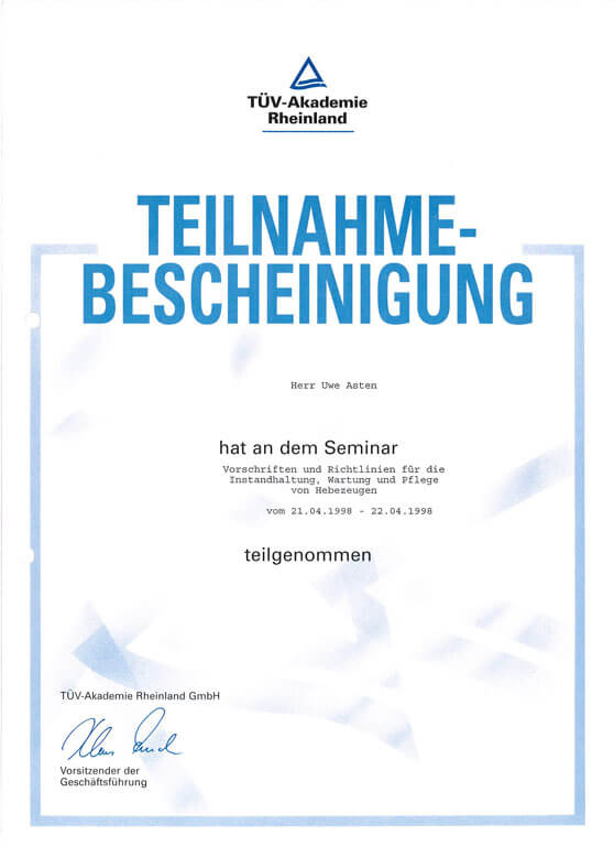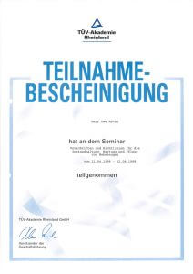 um meinen Kunden den besten Service anzubieten, habe ich zahlreiche Fortbildungen absolviert und dazu entsprechende Zertifikate vorzuweisen.